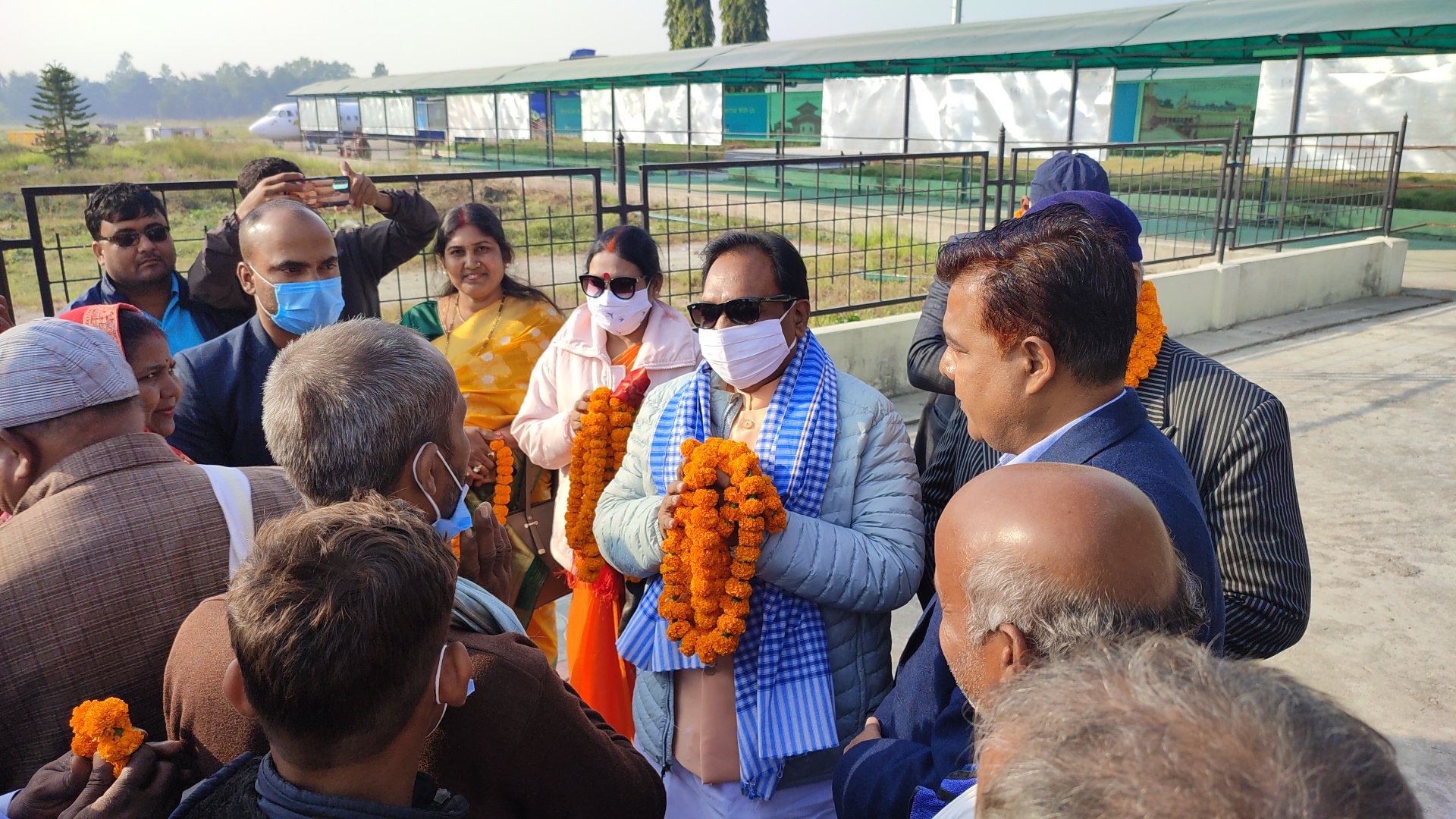 काठमाडौंबाट विमानमार्फत जनकपुरधाम आएका उनलाई दलित अगुवाहरु र मधेसी दलका नेताहरुले स्वागत गरे । लोसपा नेता वृशेषचन्द्र लाल, प्रदेश २ का जसपा साँसद चमेलीदेवी दास, दलित विकास समितिका उपाध्यक्ष रामप्रवेश बैठा लगायतले उनको स्वागतका लागि विमानस्थल पुगेका थिए ।
