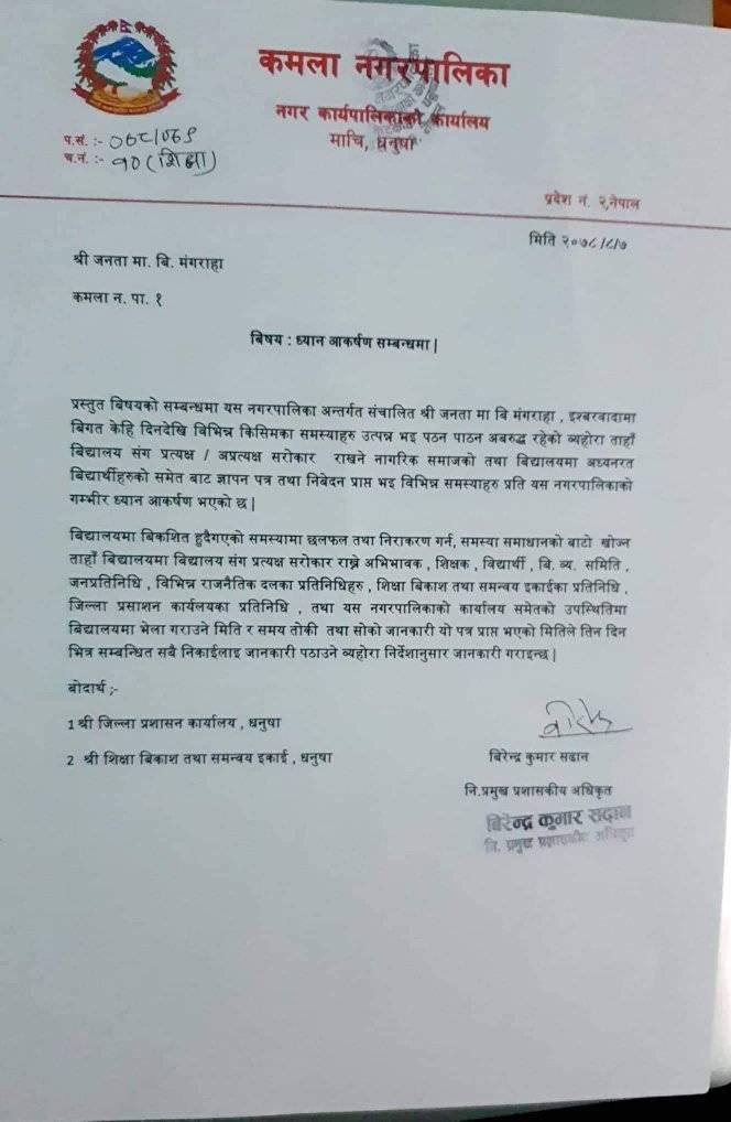 पालिकाको काम र सेवाग्राहीका समस्यालाई मध्यनजर गर्दै नगरपालिकाका प्रमुख प्रशासकिय अधिकृत बिरेन्द्र कुमार सढानले मंगलबार एक पत्र जारी गर्दै जिल्ला प्रशासन कार्यलय धनुषा र शिक्षा विकास तथा समन्वय ईकाई धनुषालाई बोधार्थ गर्दै विद्यालयलाई पत्र जारी गरेका हुन् ।